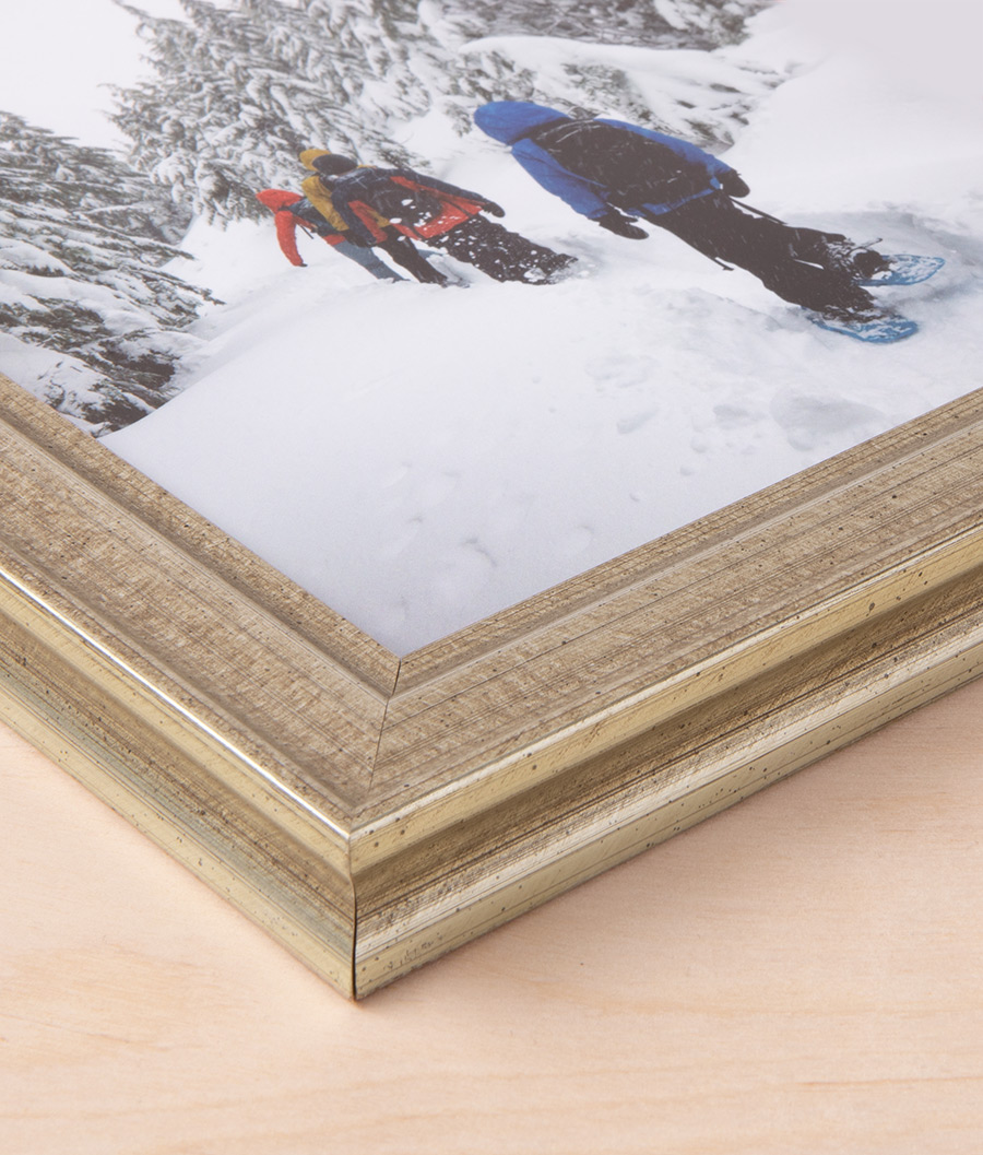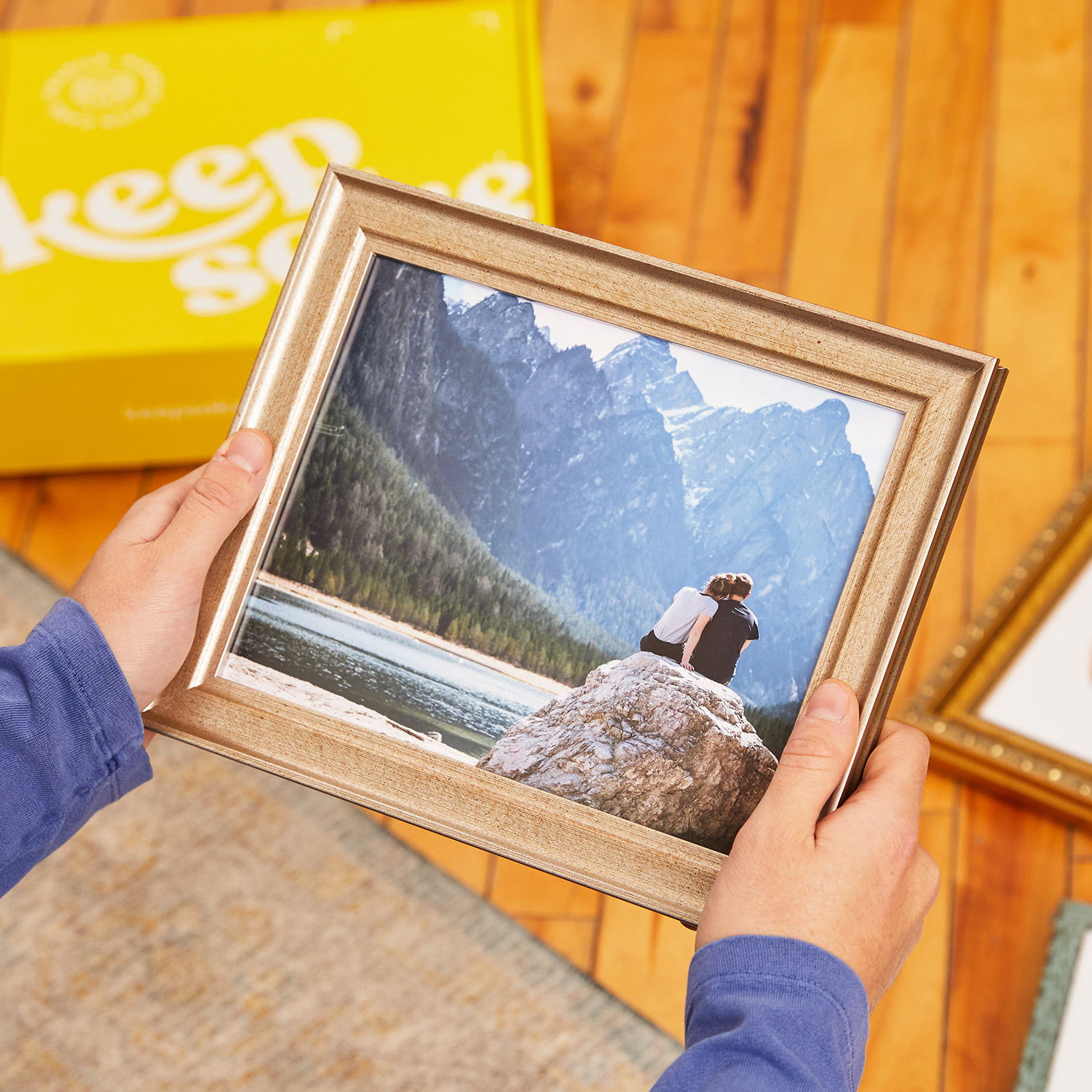 This champagne gold wood frame is charming and adds a sparkle to photos of people. Perfect for best friends and newborns.